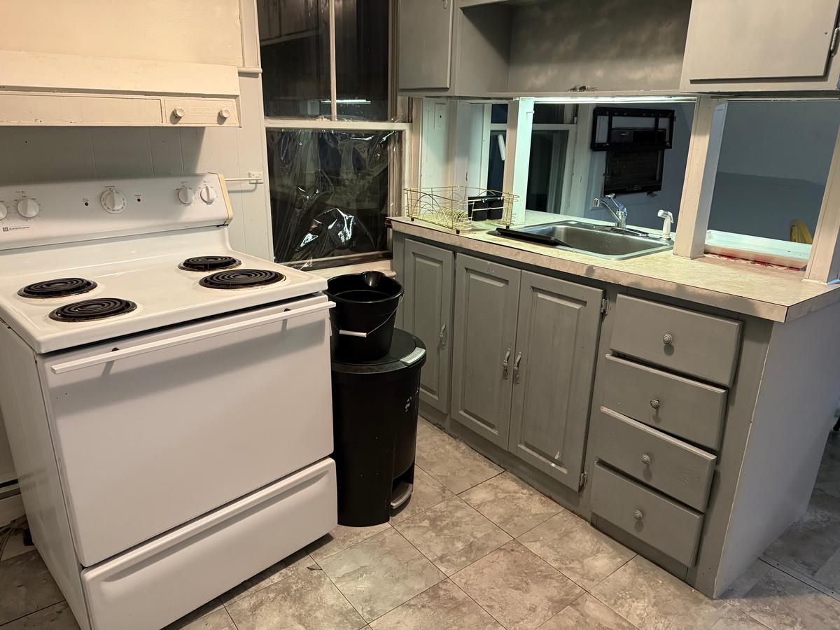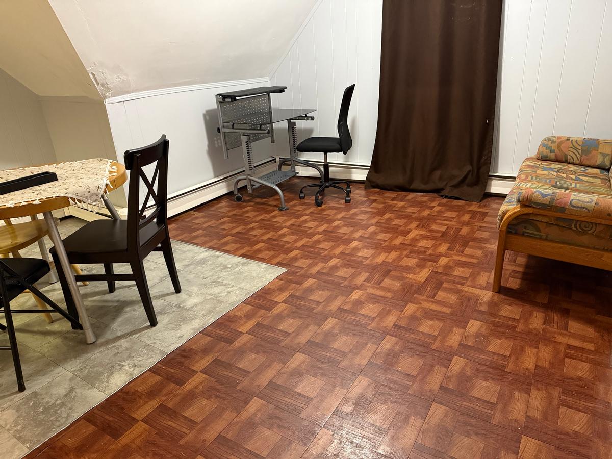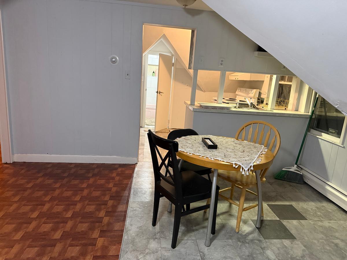 One-bedroom attic apartment for rent in East Somerville, near Sullivan Square Station. The unit includes one bedroom, a small living/dining room, kitchen, and bathroom.