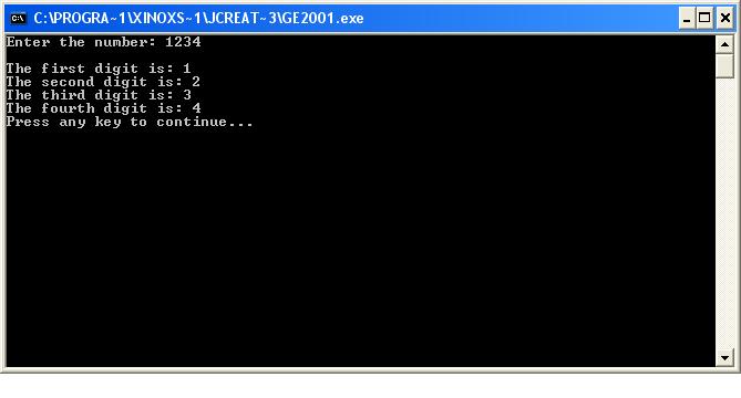 Some how this web is not displaying my codes properly ! Its omitting my cout display message ! Anyway you got the answer by slackdemic in Java :) Slackdemic, how would you read the 4 digits and input each digit in an array? Is there a way? Prompt the user to input (lets say ) 30 digits. 123.............09 Read these digits into an array and display it when we call the index value such that array[0]=1 array[2]=2 ... array[29]=9 Our code would be really ineffecient to execute this program !