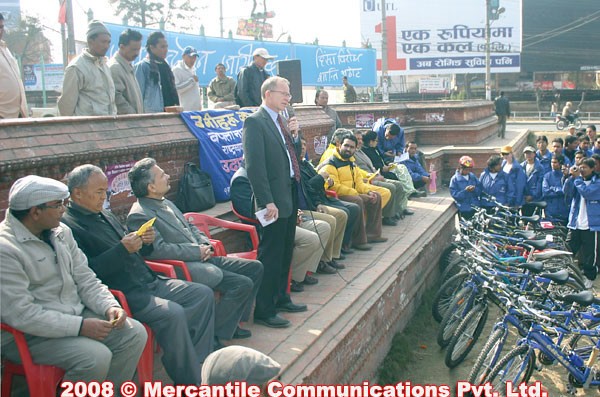 Human Rights in Nepal offering garlands to the cyclists who are setting