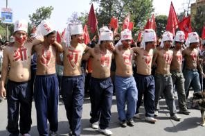 Maoist cadres organising a protest rally against President Dr Ram Baran Yadav's move to nullify the government decision to sack army chief Rookmangud Katawal
