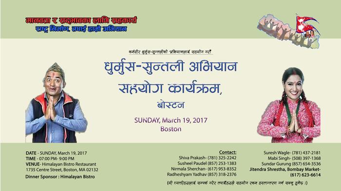मानवता र सद्भावका लागि सहकार्य राष्ट्र निर्माण, तपाईँ हाम्रो अभियान धुर्मुस-सुन्तली अभियान सहयोग कार्यक्रम बोस्टन DATE - SUNDAY, March 19, 2017 TIME - 07:00 PM- 9:00 PM VENUE- Himalayan Bistro Restaurant 1735 Centre Street, Boston, MA 02132