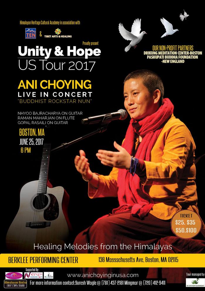 Himalayan Heritage Cultural Academy in association with Ten Media Tech proudly presents: Unity & Hope US Tour 2017 ANI CHOYING live in concert. Boston, MA . June 25, Sunday 6 PM.